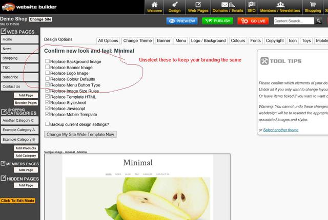 6. Untick the boxes for changing banner, logo, background and colours, if you want to keep your existing brand elements the same.